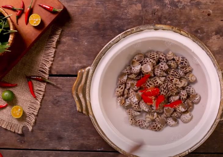 • Ngâm ốc hương với nước lạnh có thêm 4 quả ớt hiểm cắt nhỏ trong 2 – 3 tiếng cho sạch bẩn, ốc sẽ nhả bớt đất cát ra.