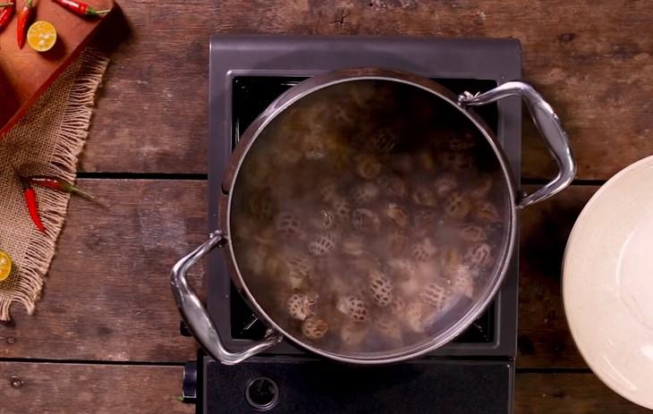 • Nước sôi thì cho ốc hương đã làm sạch vào nồi, luộc ốc hương trong lửa lớn khoảng 2 – 3 phút tính từ lúc nước sôi.