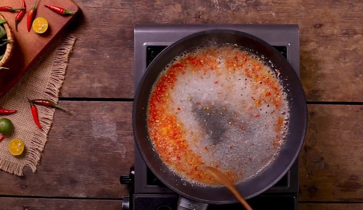Cho 1 muỗng canh muối sấy, 2 muỗng canh ớt xay, 1 muỗng canh hạt nêm, 3 muỗng canh bột ngọt và 100ml nước nấu trong lửa vừa cho tan các gia vị.