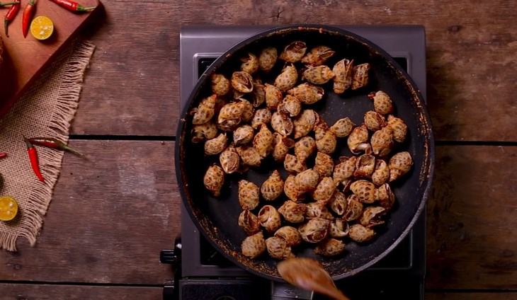 Khi hỗn hợp muối ớt ở trên đã sôi thì bạn cho ốc hương đã luộc vào, đảo đều tay cho ốc thấm gia vị.