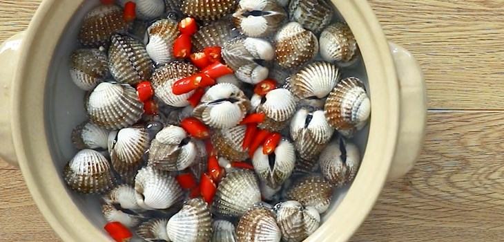 - Ngâm 1kg sò huyết cùng với 1 lít nước và 3g ớt cắt nhuyễn trong 4 tiếng.