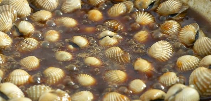 - Khi hỗn hợp hơi sệt, bạn cho 1kg sò huyết vào và đảo đến khi sò hơi hé vỏ là đã chín.