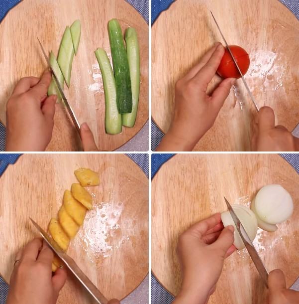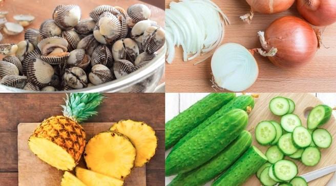 Cà chua rửa sạch, bổ làm 4. Thơm gọt vỏ, cắt bỏ mắt, cắt chéo thành miếng vừa ăn. Hành tây lột vỏ, bổ múi cau. Rau răm rửa sạch, ngắt lấy lá và ngọn non, cắt nhỏ.