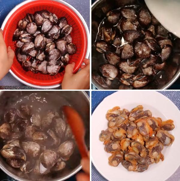 Sau đó, bạn cho sò vào nồi, cho vào 1/2 chén nước và luộc đến khi thấy sò vừa há miệng thì tắt bếp. Cho sò ra rổ cho nguội bớt rồi tách vỏ lấy thịt sò.