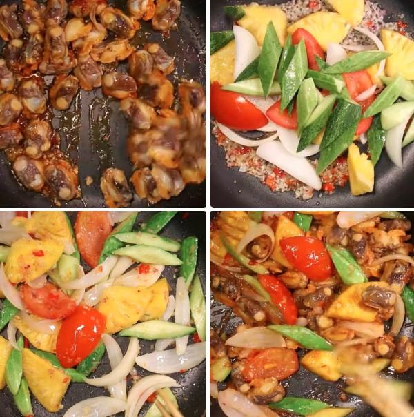 Mở lửa to rồi cho hành tây, cà chua, thơm và dưa leo vào xào trong 3 – 5 phút để các loại rau củ chín, cho đến khi hành tây chuyển màu trong. Nêm nếm với 1 muỗng canh tương xí muội và 1 muỗng canh tương cà. Đảo đều thêm 1 – 2 phút.