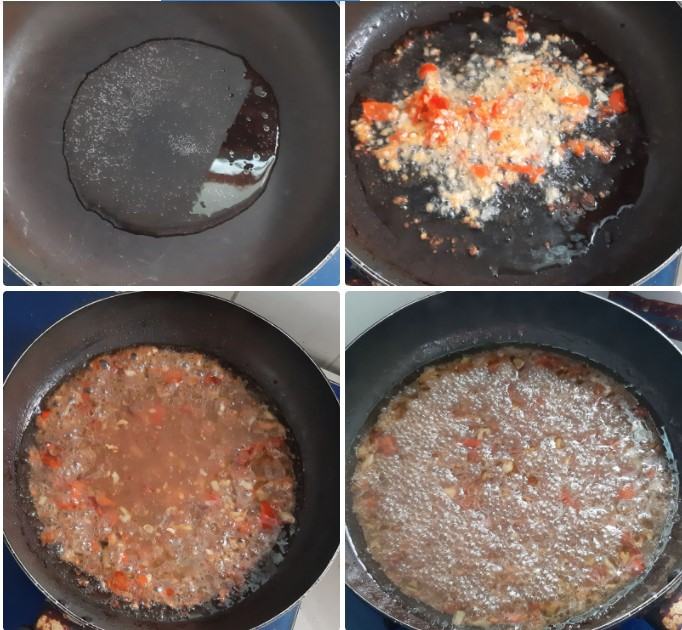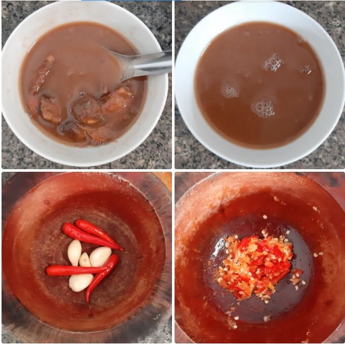 Bắc chảo lên bếp, bật lửa nhỏ đun nóng 1 muỗng canh dầu ăn rồi cho tỏi ớt đã giã nhuyễn vào phi thơm, khi tỏi hơi ngả vàng bạn cho vào chảo 1/2 chén nước lọc (chén ăn cơm), 2 muỗng canh đường, 1/2 muỗng cà phê bột ngọt, 1/2 muỗng canh hạt nêm, 2 muỗng canh nước mắm.