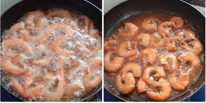 Tiếp đến, khi nước sốt đã sôi thì cho tôm đã làm sạch vào, hạ lửa nhỏ, lật trở để tôm chín đều hai mặt.