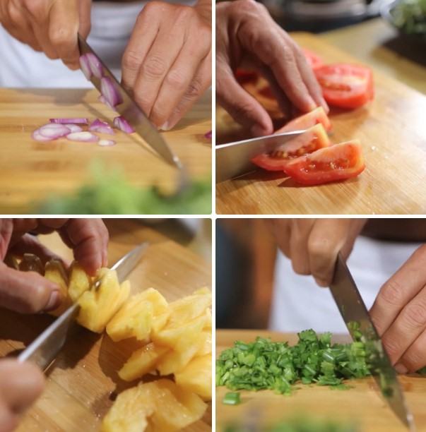 - Thơm bỏ vỏ, cắt mắt sau đó cắt thành miếng mỏng.