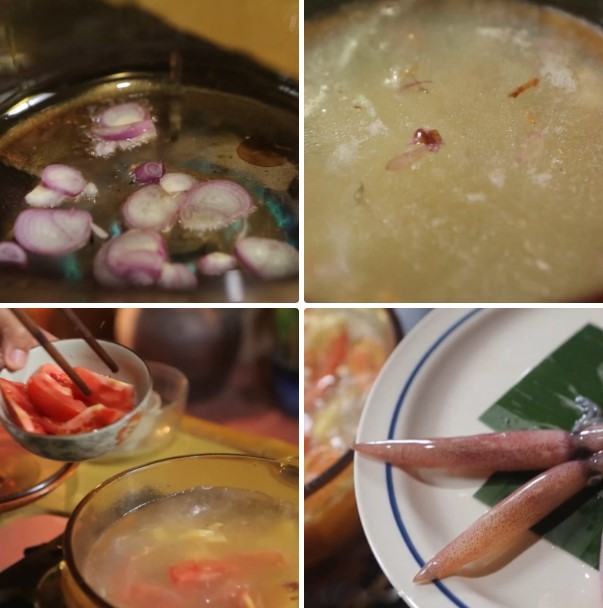 + Cho hành tím vào phi thơm sau đó cho phần cà chua và thơm vào đảo đều, cho phần nước dùng đã ninh khi nãy vào đun sôi.