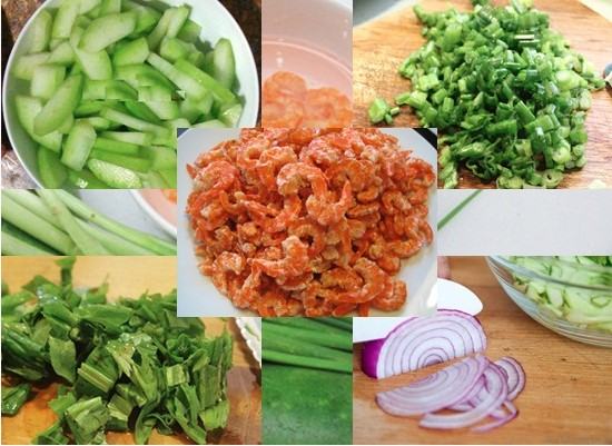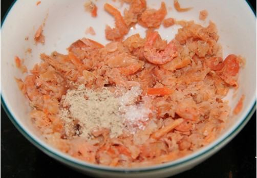 – Tôm khô ngâm nở mềm. Giã hơi dập rồi ướp với hạt nêm, muối, đường.