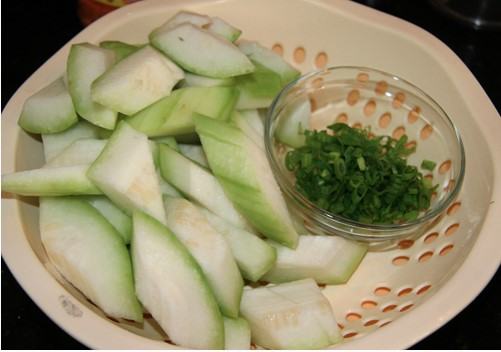 – Bí xanh gọt vỏ, rửa sạch rồi thái lát vừa ăn. Hành lá thái nhỏ.