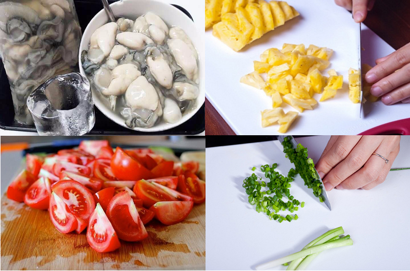 - Dứa cắt vỏ, gọt sạch những phần mắt để tránh bị rát lưỡi, sau đó thái miếng vừa ăn.