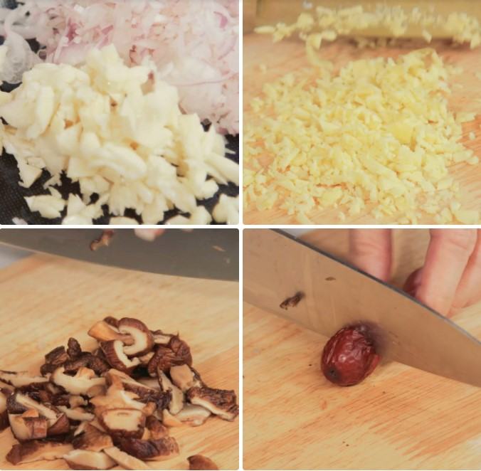 Nấm hương và táo đỏ mua về bạn cho riêng từng loại vào nước ngâm cho đến khi nở đều (theo hướng dẫn sử dụng). Sau đó bạn rửa sạch và cắt lát nấm hương. Táo đỏ bạn cắt một đường ở giữa nhưng vẫn giữ nguyên trái.