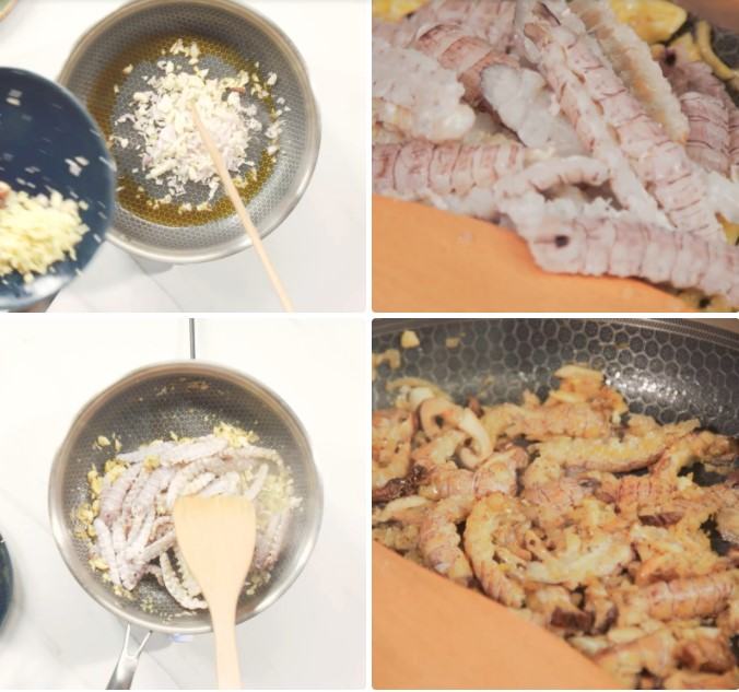 Bạn bắc chảo lên bếp, cho dầu ăn vào đến khi dầu nóng thì cho hành tỏi băm vào phi thơm.