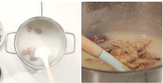 Cháo đang sôi thì bạn cho táo đỏ vào khuấy đều và nấu cùng ở lửa lớn.