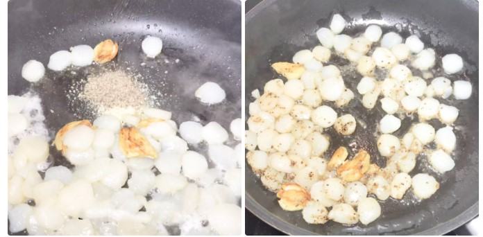 Đun sôi 1 muỗng canh dầu ăn trong chảo, cho 3 tép tỏi đập dập vào phi thơm vàng rồi cho cồi sò điệp cùng với 1 muỗng cà phê muối, 1 muỗng cà phê tiêu và trộn đều, xào với lửa vừa khoảng 8 – 10 phút thì tắt bếp.