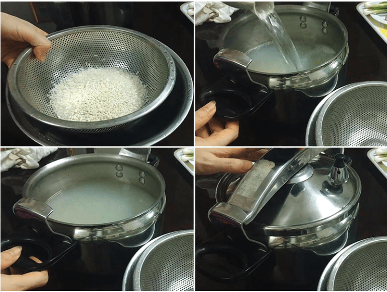Trộn đều 1 bát gạo tẻ và ½ bát gạo nếp vào nhau, vo sạch rồi cho vào nồi nước ngao. Bạn đổ thêm 1 lít nước sôi vào nồi nước ngao đã chuẩn bị trước đó để cháo không bị đặc. Sử dụng nồi áp suất để nấu cháo, cháo sẽ nhanh chín và chín đều.