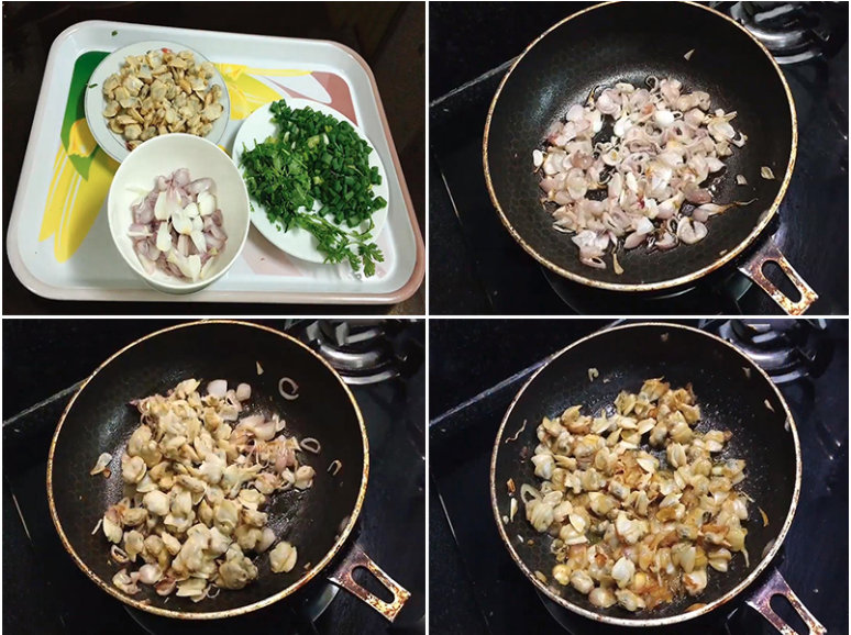 Bạn cho hành tím phi thơm lên rồi cho ngao đã tách vỏ vào xào đều lên, Bạn cho vào 1 thì dầu, 1 thìa canh nước mắm và một ít hạt tiêu. Chú ý đảo đều tay và đảo trong vòng 2-3 phút để thịt ngao không bị teo.