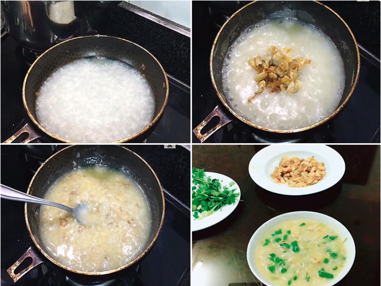 Bạn múc cháo đã nấu ở nồi áp suất ra nồi mới bắt lên bếp ga, sau đó đổ ngao đã xào vào nồi vừa đủ ăn. Cho nửa muỗng canh đường, và 1 ít hạt tiêu vào cháo. Khi cháo sôi, bạn đổ ngao vào và đảo đều. Nêm gia vị vừa ăn sau đó đổ cháo ra tô và cho hành lá lên.
