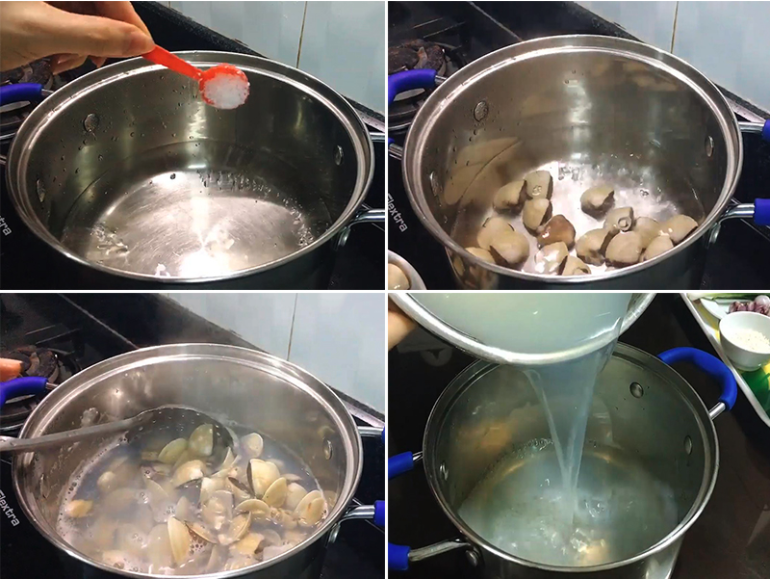 Bước này bạn cần ngâm ngao sạch, sau đó cho lên bếp đổ nước đun sôi, sau khi ngao chín, bạn vớt ngao, tách vỏ và tiến hành gạn nước.