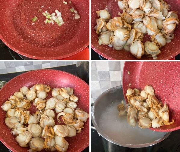 Cho khoảng 1 muỗng canh dầu ăn vào chảo đun với lửa vừa. Đợi dầu sôi và có các bọt khí lăn tăn thì cho 1/2 phần đầu hành vừa được băm nhuyễn vào. Khi hành dậy mùi thơm bạn cho sò điệp vào, đảo đều từ 5 – 7 phút khi thịt sò vừa săn lại thì tắt bếp. Tiếp đến, cho sò vừa xào vào cháo khuấy đều.