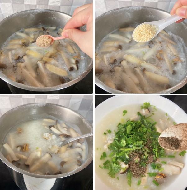 Trong thời gian chế biến sò và nấm thì cháo cũng đã nhừ. Đợi cho cháo sôi thêm từ 3 – 4 phút, nêm hỗn hợp gia vị gồm: 2 muỗng canh hạt nêm, 3 muỗng cà phê đường, 2 muỗng cà phê bột ngọt, khuấy đều và cho cháo sôi thêm 5 – 7 phút, nêm nếm lại gia vị cho vừa miệng, tắt bếp.