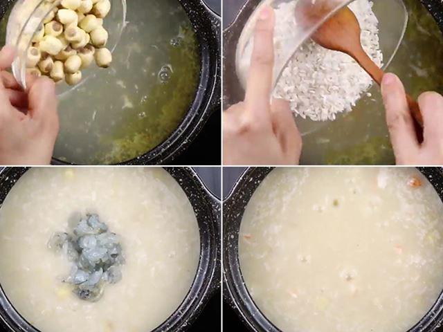 Cho hạt sen vào nước luộc tôm, đậy nắp và nấu khoảng 10 phút thì đổ gạo vào. Ta sẽ khuấy đều cho đến khi gạo nở, chín mềm. Sau đó, cho thịt tôm cùng lượng gia vị đã chuẩn bị sẵn: muối, bột ngọt và hạt nêm vào, khuấy đều. Cuối cùng, nấu đến khi sôi thì tắt bếp, vậy là xong rồi đó.