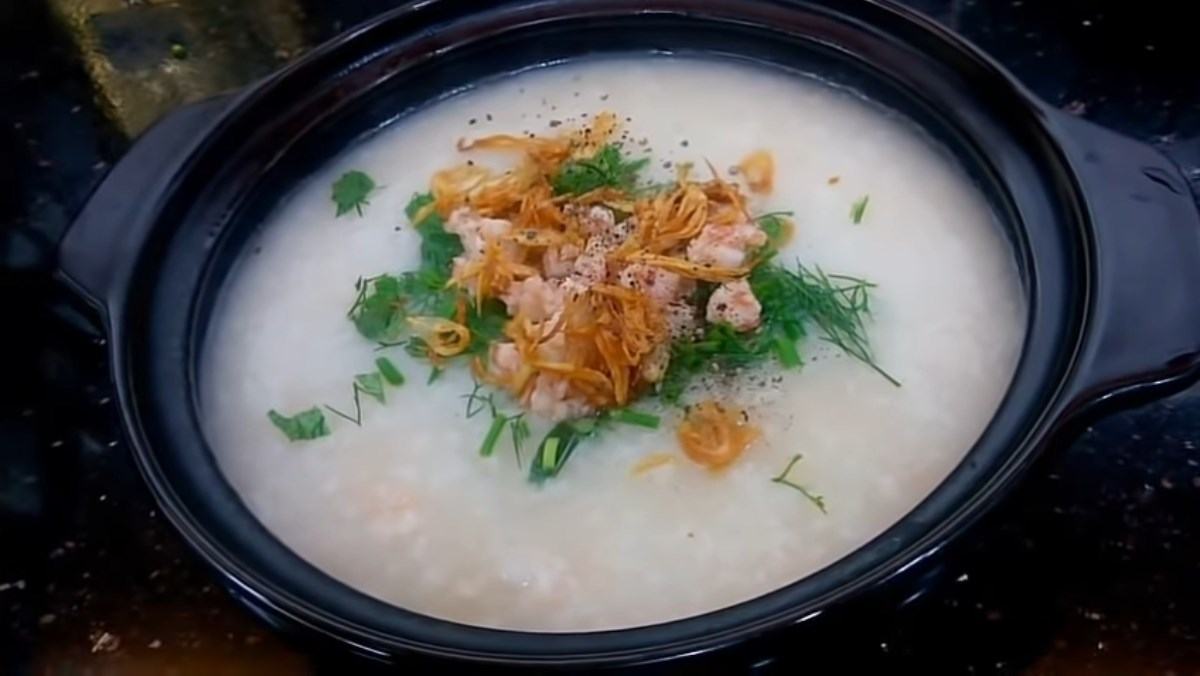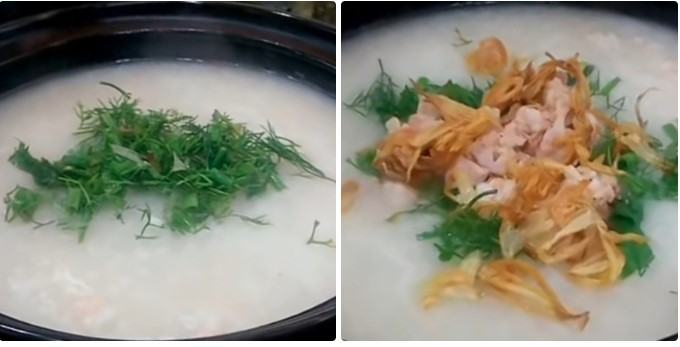 Cháo tôm sau khi nấu chín thì bạn cho ra tô, trang trí lên trên một ít hành và rau thơm là thưởng thức thôi.