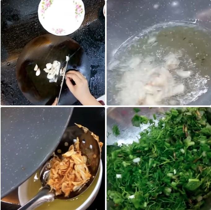 Bắc chảo lên bếp, thêm vào khoảng 200ml dầu ăn, đợi đến khi dầu sôi thì cho toàn bộ phần hành tím đã cắt lát vào phi vàng thơm.