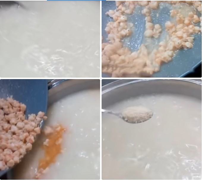 Tiếp đó bạn sẽ bắc nồi lên bếp, cho toàn bộ phần gạo đã rang vào cùng với 2 lít nước và ninh nhỏ lửa cho gạo chín mềm. Khi phần cháo đã hơi sệt lại thì bạn bắt đầu cho phần nước cốt tôm từ từ vào để đạt được độ sánh đặc như mong muốn nhé!