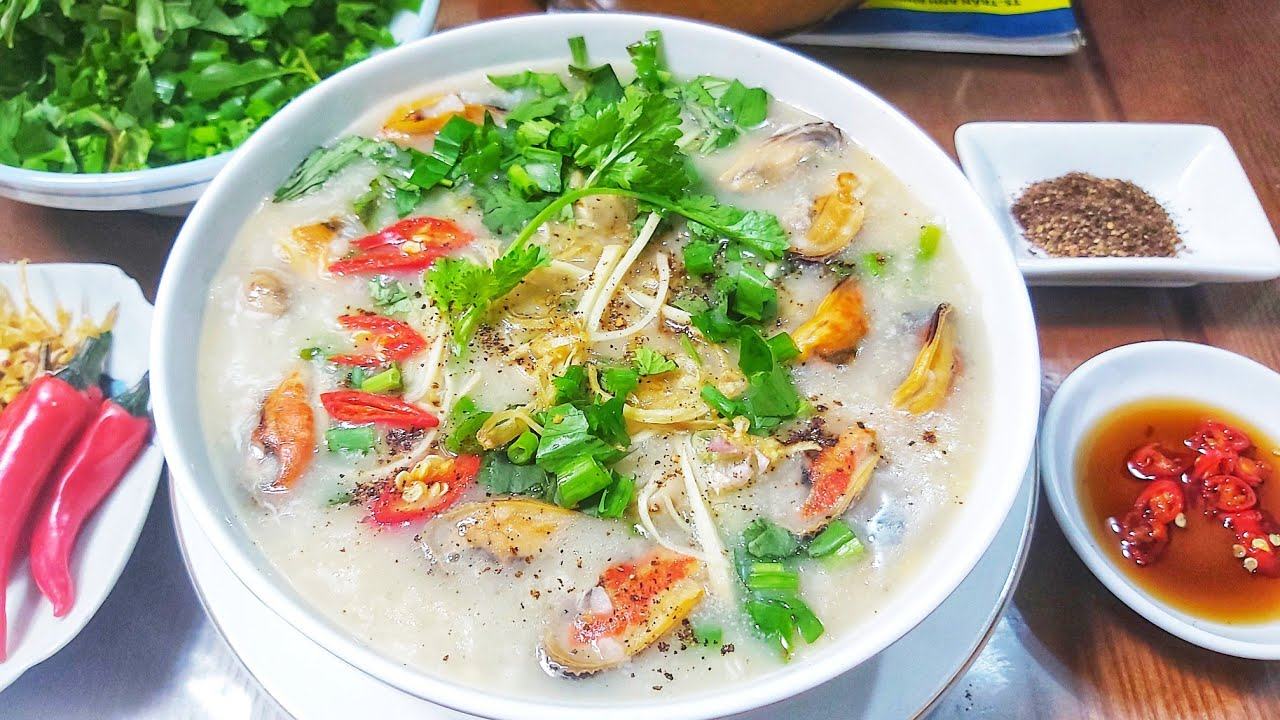 – Cháo sau khi hầm có độ nhừ thì trút thịt vẹm đã xào vào nồi, nêm 1/4 muỗng muối, 1/4 muỗng hạt nêm đun thêm cháo trong thời gian 10 phút nêm nếm lại gia vị sao cho vừa miệng rồi cho hành lá, lá mùi, rau răm vào nồi rồi tắt bếp.