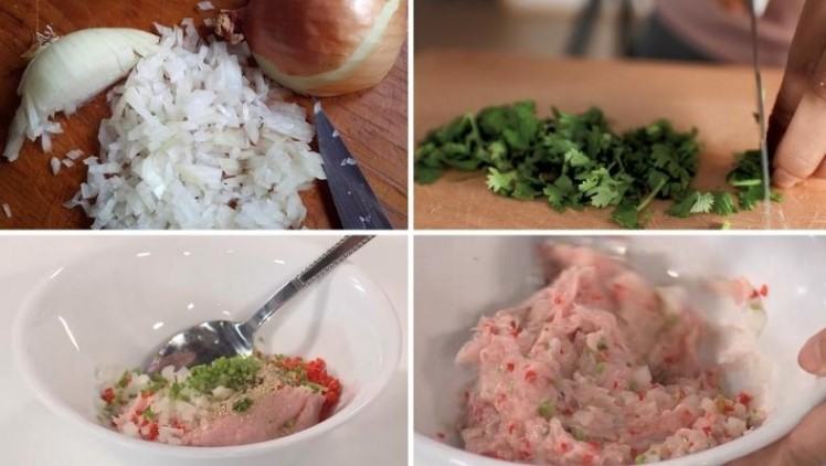 – Trộn đều giò sống với 2M hành tây, 1/2M cọng ngò băm, 1/2m tiêu và 1M ớt sừng băm.