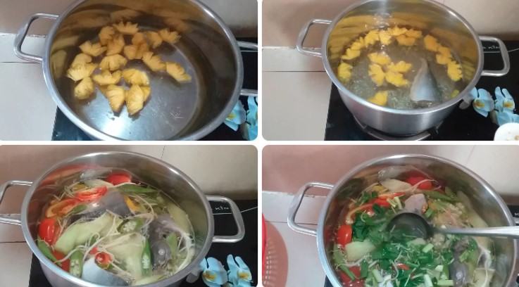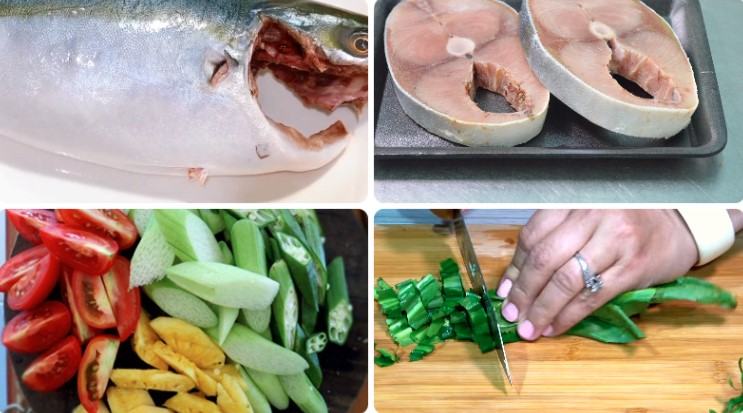 Cá cam mua về thì bạn làm sạch rồi rửa lại với nước. Thơm thì cắt nhỏ, đậu bắp thì cắt xéo vừa ăn. Với cà chua nên cắt múi cau, bạc hà cắt nhỏ, giá rửa sạch và cuối cùng là rau om, ngò gai thì cắt nhuyễn.