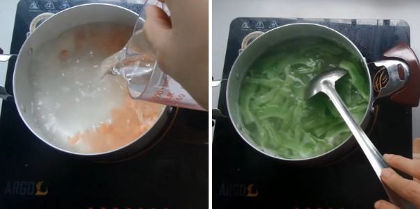 Khi tỏi đã thơm, cho tôm khô đã ngâm vào, đảo đều khoảng 30 giây cho tôm hơi săn lại rồi thêm 800ml nước, đậy nắp và đun lửa vừa khoảng 5 phút.