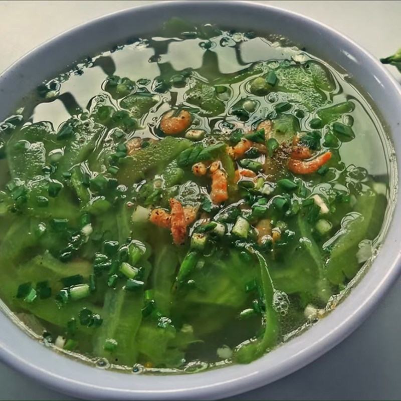Canh khổ qua tôm khô sau khi hoàn thành có màu sắc đẹp mắt, hương thơm hấp dẫn. Nước canh thanh dịu, đắng nhẹ hòa quyện cùng tôm khô dai dai và mướp đắng giòn ngon.