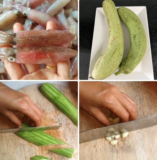 Mướp hương mua về, bạn gọt vỏ, rửa sạch rồi cắt khúc ngắn vừa ăn, dày khoảng 1 đốt ngón tay.