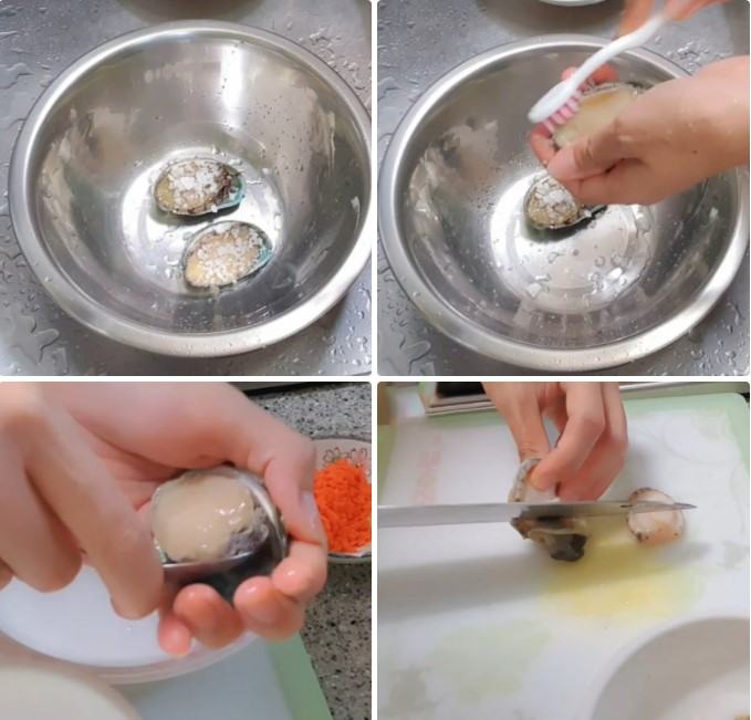 Bạn dùng muỗng tách bào ngư ra khỏi vỏ. Tiếp đến, dùng dao cắt bỏ phần miệng đi rồi thái nhỏ phần thịt bào ngư ra.