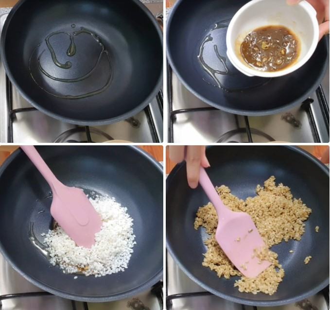 Bắc chảo lên bếp, cho 1 muỗng cà phê dầu ô liu vào, đợi dầu nóng, bạn cho gạo và phần bao tử của bào ngư vào đảo đều trong khoảng 10 phút đến khi 2 nguyên liệu hòa quyện vào nhau