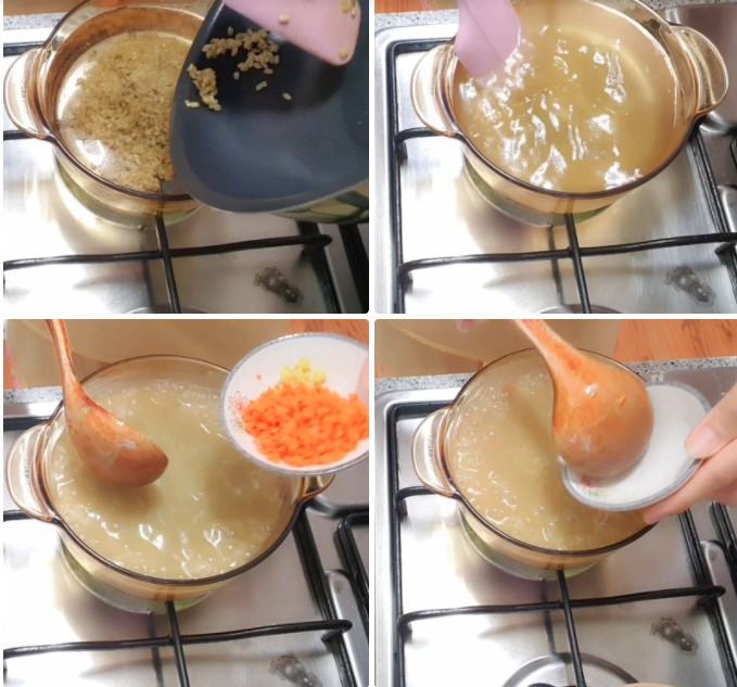 Bạn bắc nồi nước lên bếp. Tiếp đến, cho gạo đã xào vào rồi đun khoảng 15 phút để gạo nở hoàn toàn. Cho thêm cà rốt vào nồi và tiếp tục khuấy đều.