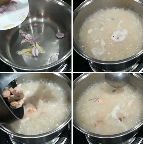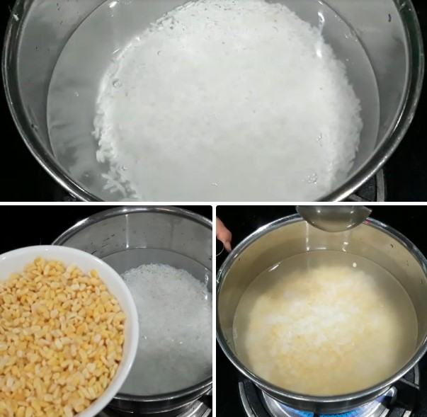 Đỗ xanh, gạo nếp, gạo tẻ ngâm chừng 20p. Rang vàng thơm rồi đem xay, không xay quá mịn. Đem nấu cùng nước dùng xương heo/gà/cá. Khuấy liên tục vì gạo xay dễ khê hơn gạo hạt.