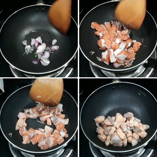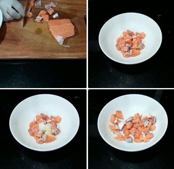 Cá hồi thấm khô thái hạt lựu ướp với chút rượu, gừng băm nhỏ hoặc bột gừng, muối 15p cho hết tanh. Phi thơm hành khô xào cá cho thơm, nêm hạt nêm và hạt tiêu cho vừa khẩu vị. Nghiền nhỏ cá.