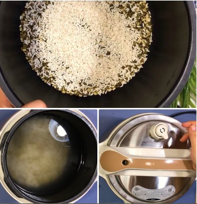 Sau khi đã đãi xong các bạn cho gạo và đậu vào nồi áp suất, thêm tiếp 700ml nước lọc, 2 muỗng cà phê hạt nêm, 1/2 muỗng cà phê muối, 1/4 muỗng cà phê bột ngọt, 1 muỗng cà phê đường sau đó bật chế độ nấu cháo và ninh khoảng 30 phút cho cháo nhừ.