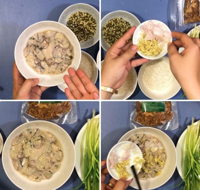 Ướp hào với 1/2 muỗng cà phê hạt nêm, 1/3 muỗng cà phê bột ngọt, 1/3 muỗng cà phê muối, 2/3 muỗng cà phê đường, 2/3 lượng gừng băm và hành tím cắt lát. Trộn đều và để cho hàu ngấm gia vị khoảng 15 – 20 phút.