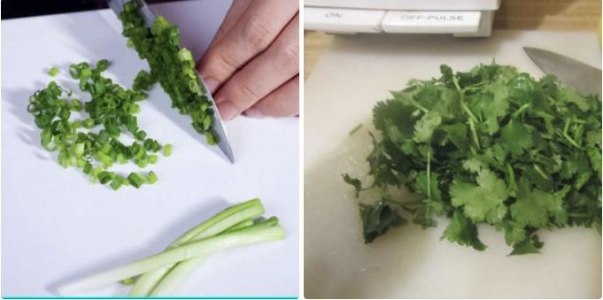 Hành lá các bạn rửa sạch. Phần lá cắt nhỏ, phần đầu hành giữ nguyên.