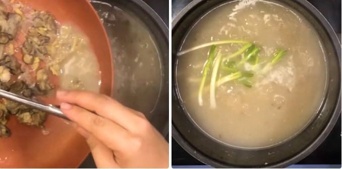 Cháo sau khi đã nấu được 30 phút, các bản xả nồi áp suất, sau đó cho hàu và đầu hành lá vào, ủ cháo thêm 5 phút nữa là hoàn thành.