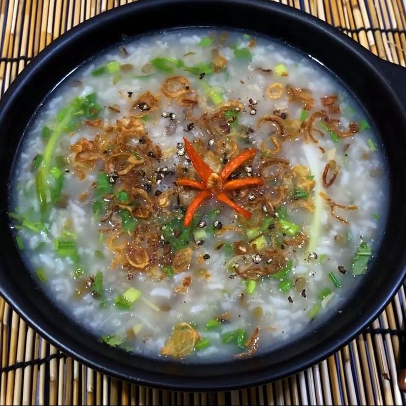 Múc cháo ra tô, cho thêm hành lá, rau răm và hành phi và một chút tiêu lên trên, trang trí lại cho đẹp mắt là hoàn thành