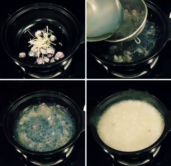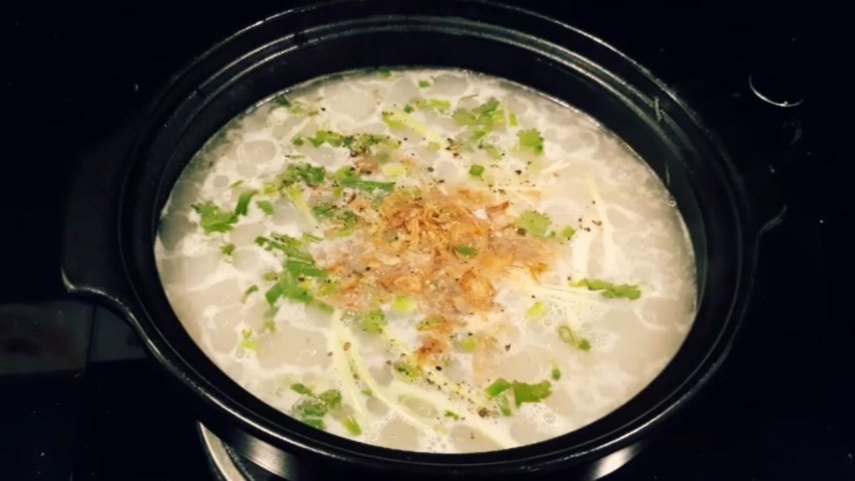 Sau khi cháo chín, bạn cho hết phần đầu hành, ngò rí và lá hành cắt nhỏ, 1 nửa phần gừng cắt sợi còn lại vào nồi, rắc thêm 1 ít tiêu xay và hành phi là hoàn thành rồi.