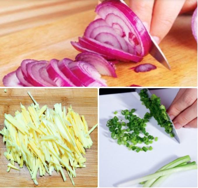 Hành tím bóc vỏ rồi dùng dao cắt lát mỏng. Gừng gọt bỏ vỏ, rửa sạch rồi cắt sợi.