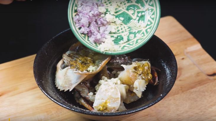 Ướp cua với gia vị 1 muỗng cà phê hạt nêm, 1 muỗng cà phê tiêu, 1 muỗng cà phê bột ngọt, 1/2 muỗng cà phê muối, 10gr hành tím băm, 10gr tỏi băm.
