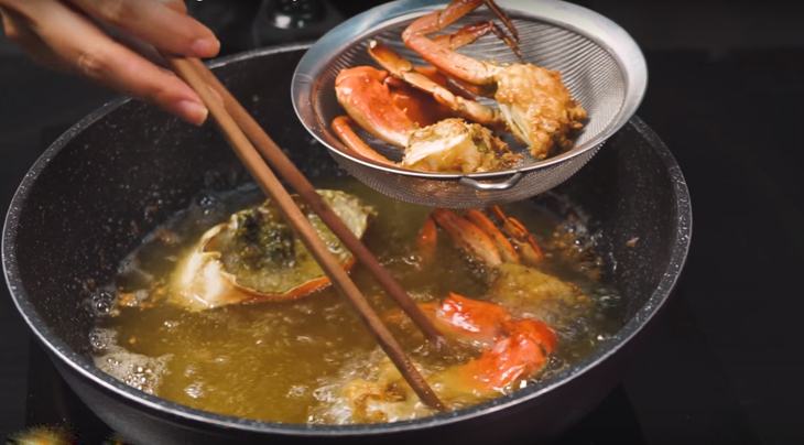 Cua sau khi ướp, sau đó bỏ chiên giòn với bột. Sau đó bỏ cua vào chảo dầu ăn đang nóng, chiên giòn. Vớt cua ra cho vào dĩa có lót giấy thấm dầu.